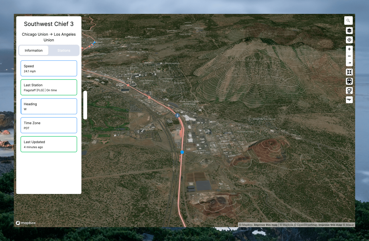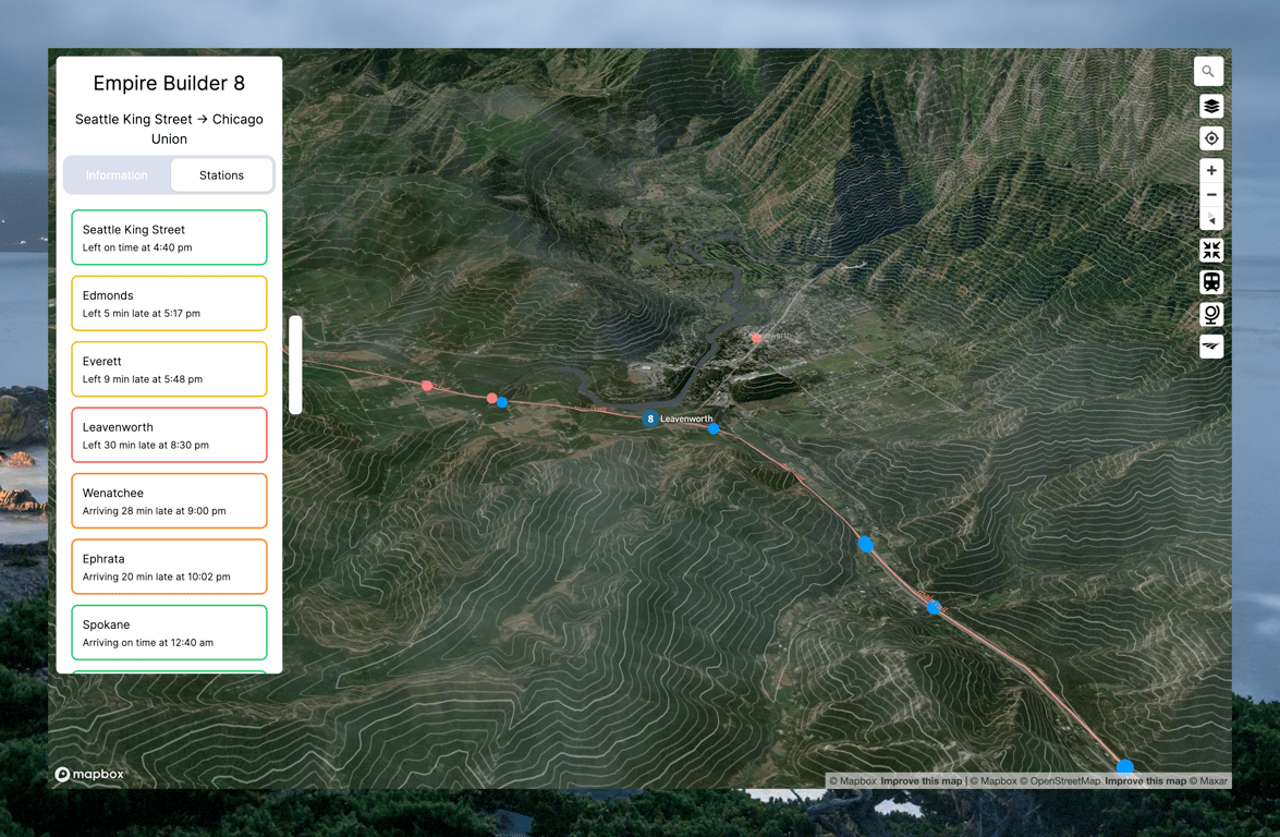 Although it was never really announced, the has supported live tracking of Amtrak via amtrak.js since v1.4. This release includes the major updates to train tracking mentioned above, along with more information about each station! You can see which trains are on their way, and when. Clicking on a train in the side panel will also bring up the relevant train information, and also move the map to the current train location.